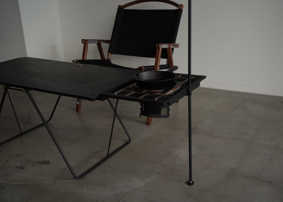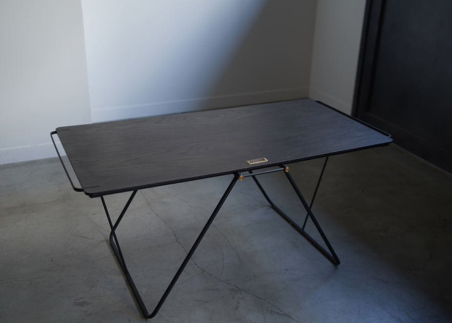 今までの機能はそのままに、トップを黒染色とウレタンコートで仕上げています。木目の模様が楽しめるようにベースはホワイトオークを使用し、キャンプでの日の当たり方で表情を変える仕上げとなっております。